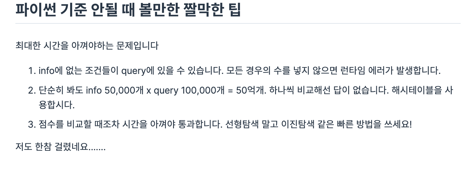 이렇게 풀면 문제는 풀리지만 효율성에서 탈락이다. 왜냐면 candidate를 비교하는데 너무 많은 자원이 들기 때문이다. 해당 코드는 O(len(query)*N)의 시간복잡도를 가지기 때문에 query가 많아질수록 결과적으로 O(N^2)의 시간복잡도를 가져서 효율성에서 0점 나온다..
