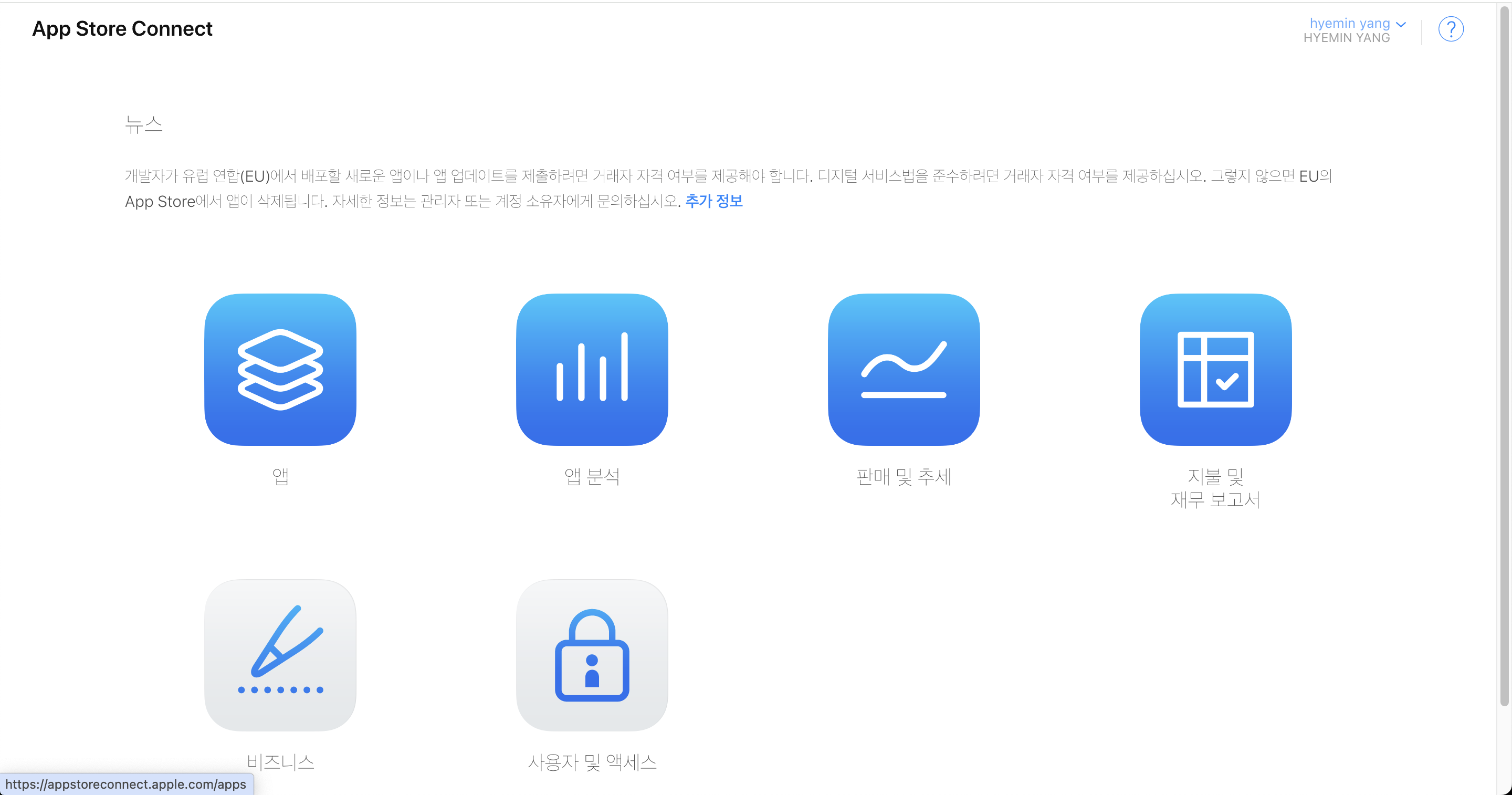 그럼 https://appstoreconnect.apple.com/ 로 접속하여 앱을 등록해주자.